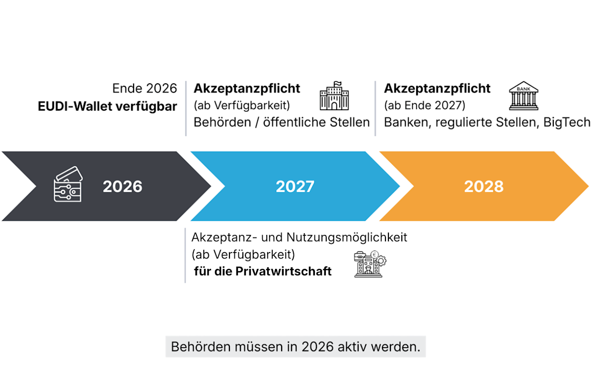 Öffentliche Stellen müssen EUDI Wallets akzeptieren, sobald diese für Bürgerinnen und Bürger verfügbar sind – voraussichtlich gegen Ende 2026.